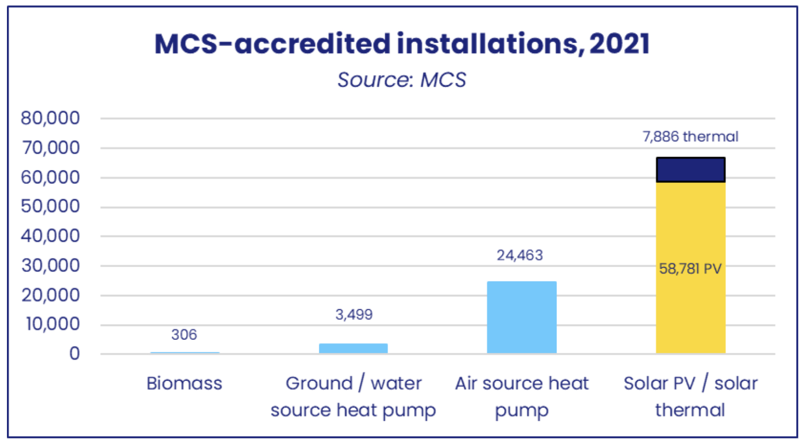 As the UK begins to decarbonise space and water heating, the contribution onsite solar technologies will make is also starting to be felt. There were nearly 67,000 solar PV and solar thermal installations accredited by the Microgeneration Certification Scheme in 2021, far outperforming the number of heat pumps.
