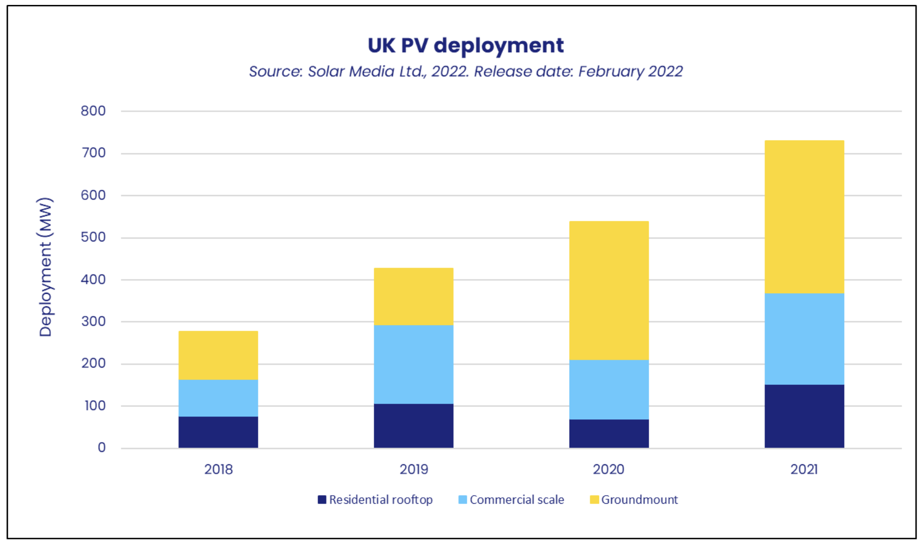Finlay Colville, Head of Research at Solar Media Ltd, said: “2021 was potentially the most significant year for the solar industry in the UK, with clear signs that the market can now exist with gigawatt-plus levels of annual deployment going forward. For the first time also, each of the three key segments – residential, commercial rooftop and ground-mount – is seeing stable growth and an increase in the planning of new projects for the future.”