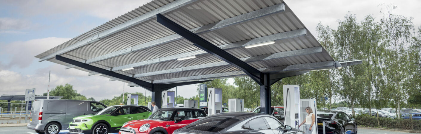 EvoEnergy designed and constructed a new innovative ‘Hyperhub’ alongside Monks Cross Park and Ride in York. The Hyperhub consists of 4 Rapid (50kW) and 4 Ultra Rapid (150kW) charging points, covered by a solar canopy (100kWp) and supported by a Tesla battery system (348kW/507kWh).